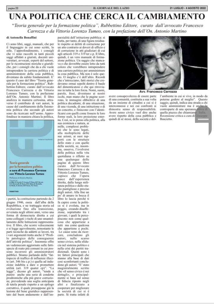 Pubblichiamo parte della rassegna stampa dedicata al libro "Teoria generale per la formazione politica" a cura di Francesco Carrozza con Vittorio Lorenzo Tumeo, con la prefazione di Antonio Martino ed edito da Rubbettino Editore.
