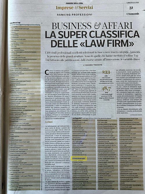 Lo Studio Carrozza è stato inserito, per il secondo anno consecutivo, tra le law firm eccellenti in Italia nel 2025 nella lista pubblicata dal Corriere della Sera nell’ambito dello speciale nell’inserto “L'Economia”.